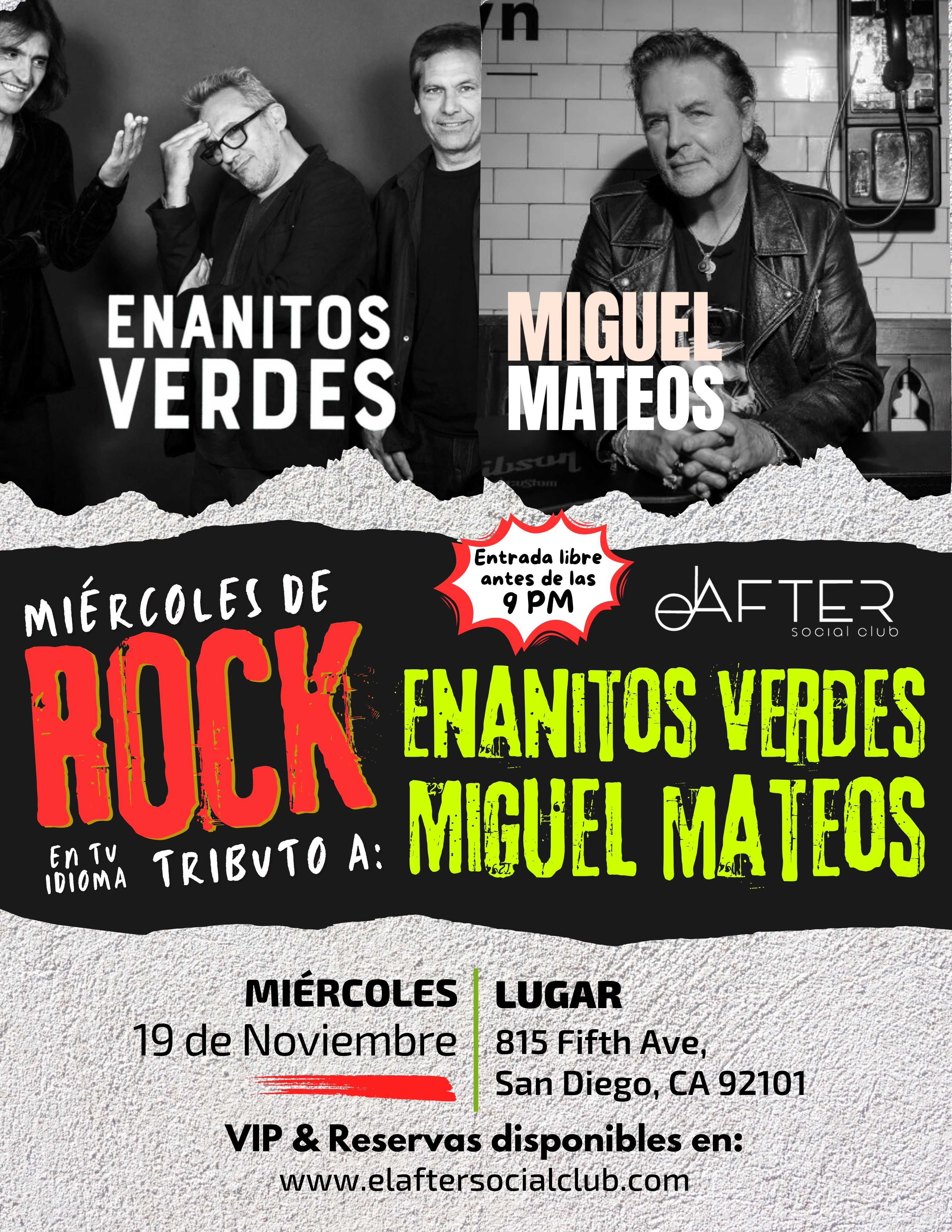 Revive los clásicos del rock en español en una noche llena de energía y nostalgia. Disfruta un show en vivo homenajeando a Enanitos Verdes y Miguel Mateos, interpretando sus éxitos más icónicos con todo el ritmo y la pasión que los hicieron legendarios.