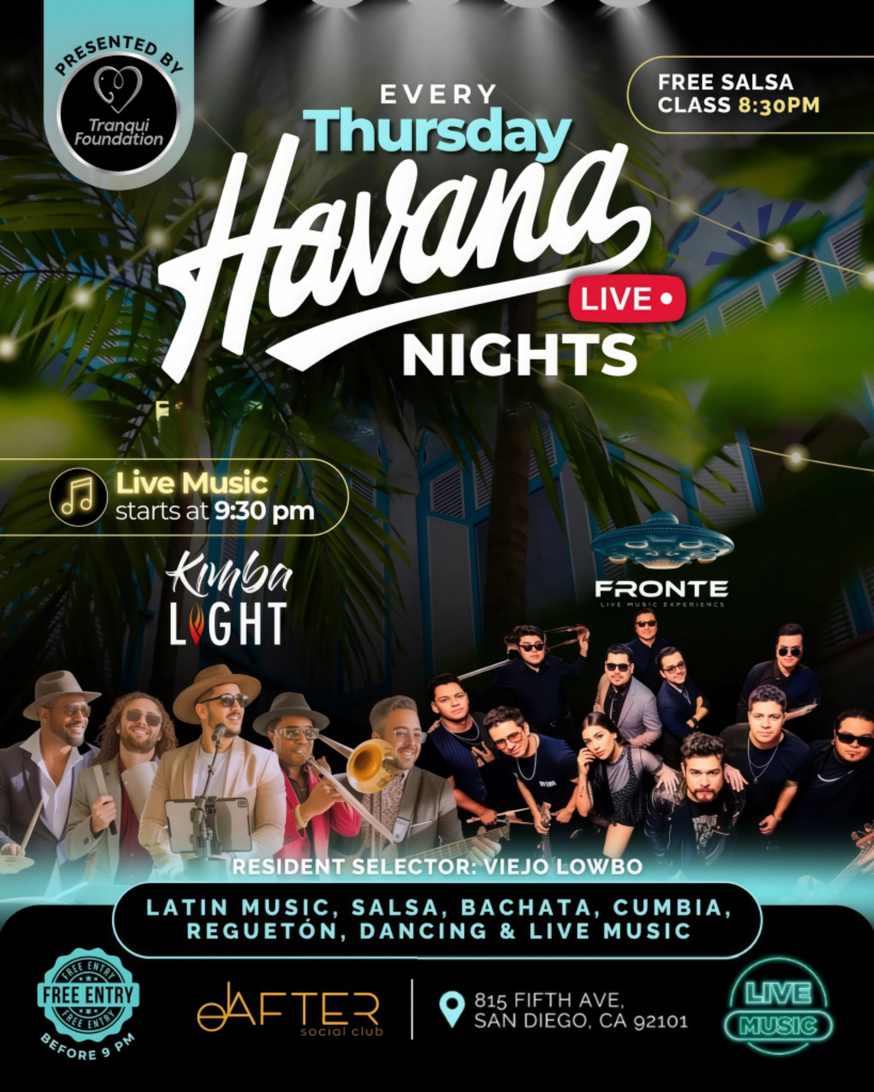 Experience the magic of Cuba with two electrifying live bands — Kimba Light and Fonte — bringing the rhythms of salsa, timba, and son cubano straight to San Diego.